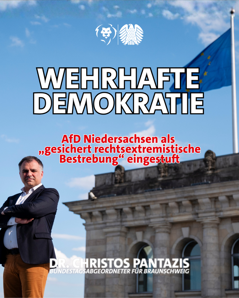 Der direkt gewählte Bundestagsabgeordnete für Braunschweig und gesundheitspolitische Sprecher der SPD Bundestagsfraktion, Dr. Christos Pantazis, begrüßt die Entscheidung des niedersächsischen Verfassungsschutzes, den Landesverband der AfD Niedersachsen als Beobachtungsobjekt von erheblicher Bedeutung einzustufen, ausdrücklich.